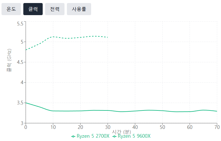 클럭 속도에서 주목할 점은 2700X가 최대 4.35GHz까지 부스트 가능함에도 빌드 중 평균 3,287MHz, 최대 3,881MHz에 머물렀다는 것이다. LP 쿨러의 한계로 인한 발열과 그에 따른 쓰로틀링이 원인이다. 반면 9600X는 평균 5,082MHz를 유지하며 안정적으로 고클럭을 유지했다.