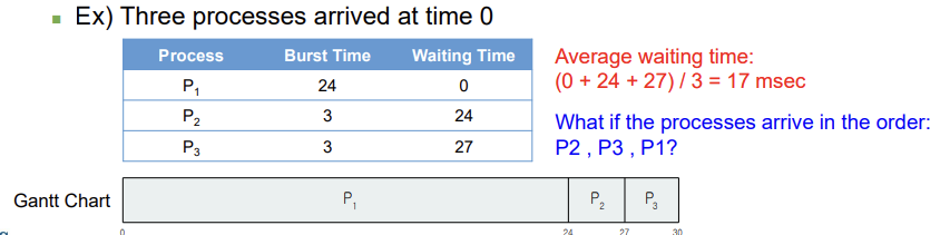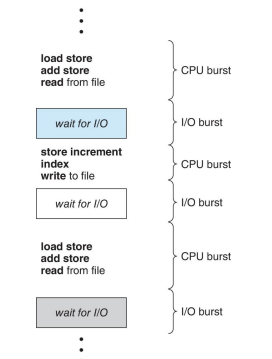 CPU 버스트(CPU Burst): 프로세스가 CPU를 사용하여 명령어를 실행하는 시간입니다. 이 시간 동안 프로세스는 계산이나 데이터 처리와 같은 작업을 수행합니다.