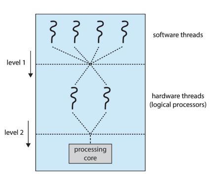 쓰레드 스케줄링에 관하여, 현대 운영 체제들 대부분에서 스케줄링 되는 것은 프로세스가 아닌 커널 레벨 쓰레드입니다. 사용자 레벨 쓰레드는 쓰레드 라이브러리에 의해 관리되며, CPU에서 실행되기 위해서는 최종적으로 관련된 커널 레벨 쓰레드에 매핑되어야 합니다. 이 매핑은 간접적일 수 있으며, 가벼운 프로세스(Lightweight Process, LWP)를 사용할 수 있습니다.
