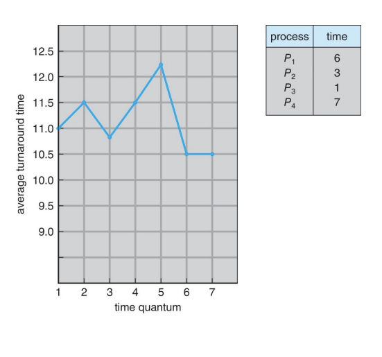 시간 할당량(타임 퀀텀)의 크기는 프로세스의 평균 반환 시간(Turnaround Time)에도 영향을 미칩니다. 평균 반환 시간은 시간 할당량의 크기에 비례하거나 반비례하는 관계가 아닙니다. 대부분의 프로세스가 다음 CPU 버스트를 단일 시간 할당량 내에 완료할 수 있으면 평균 반환 시간이 개선됩니다.