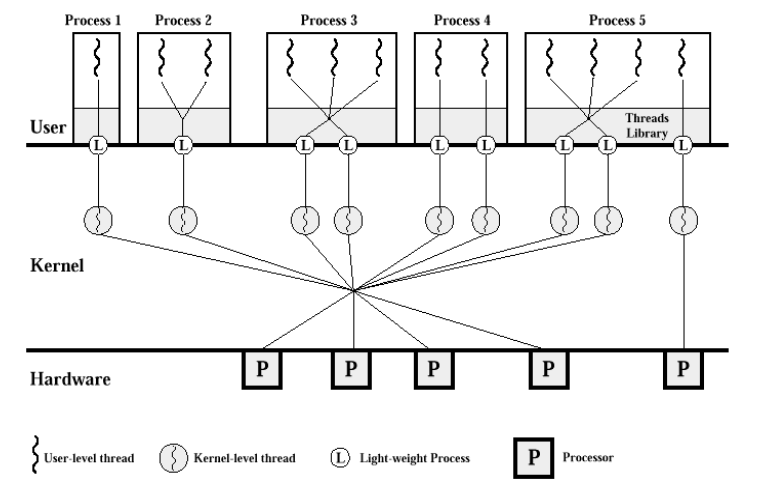 "LWP는 사용자 레벨 쓰레드와 커널 레벨 쓰레드 사이의 중간자 역할을 합니다." 사용자 레벨 쓰레드가 실제로 CPU 자원을 사용하기 위해서는 LWP를 통해 커널 레벨 쓰레드에 연결되어야 합니다. LWP는 커널에 의해 스케줄링되는 동시에, 여러 사용자 레벨 쓰레드를 하나의 LWP에 매핑할 수 있어 유연성을 제공합니다.