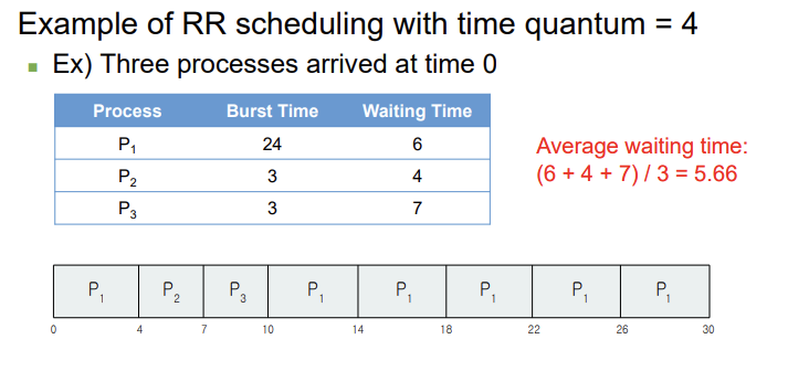 Round Robin 스케줄링의 주요 장점은 각 프로세스가 동일한 시간 동안 CPU를 사용할 수 있기 때문에, 모든 프로세스가 공정하게 처리될 수 있다는 점입니다. 그러나 타임 퀀텀의 크기 선택은 성능에 큰 영향을 미칠 수 있습니다. 타임 퀀텀을 너무 작게 설정하면 컨텍스트 스위칭으로 인한 오버헤드가 증가하고, 너무 크게 설정하면 RR 스케줄링이 사실상 FCFS 스케줄링과 유사해져 프로세스 대기 시간이 증가할 수 있습니다. 따라서 타임 퀀텀의 적절한 크기 설정이 중요합니다.