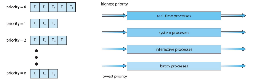 고정 우선순위 선점 스케줄링: 더 높은 우선순위 큐의 프로세스가 모두 완료될 때까지 낮은 우선순위 큐의 프로세스는 실행되지 않습니다. 즉, 높은 우선순위 큐가 비어 있을 때만 낮은 우선순위 큐의 프로세스가 실행될 수 있습니다.