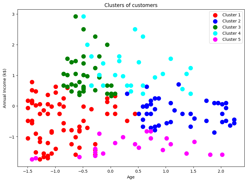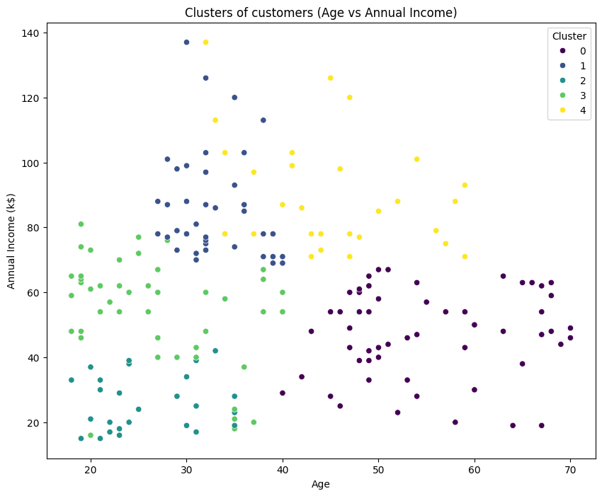 plt.title('Clusters of customers (Age vs Annual Income)')