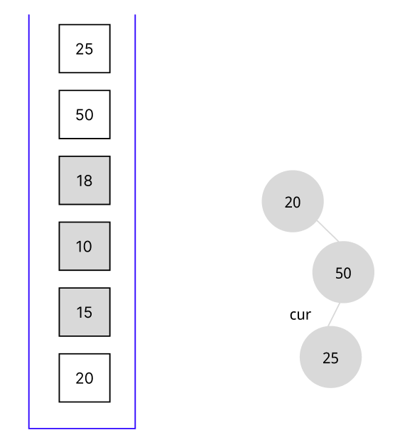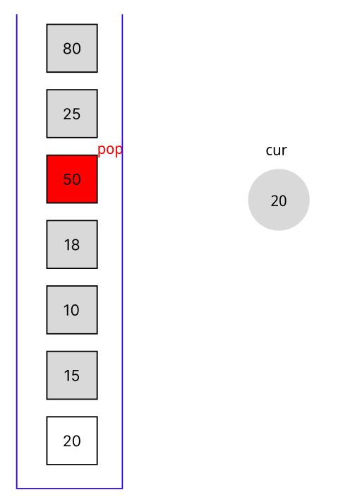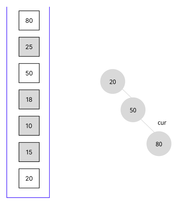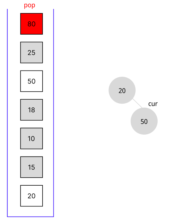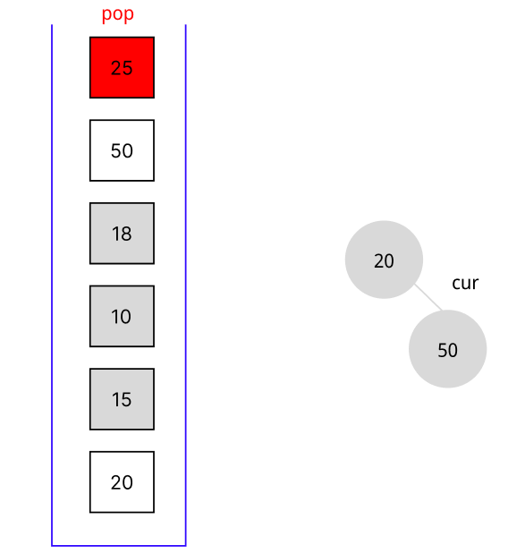 20을 확인했더니 왼쪽 노드는 이미 방문하였고, 방문하지 않은 오른쪽 노드가 있다. 오른쪽 노드(50)를 추가한다.