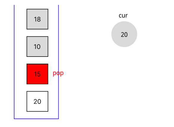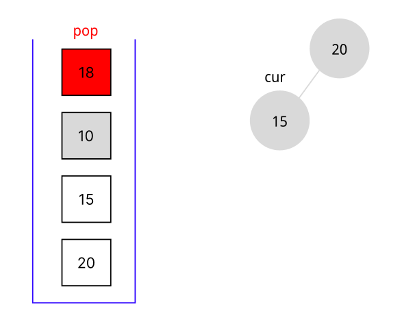 15를 확인했더니 오른쪽 노드와 최근 방문한 노드(18)이 같다. 이미 방문했기 때문에 18을 추가하지 않고 더이상 방문할 자식 노드가 없기에 15를 방문한다.