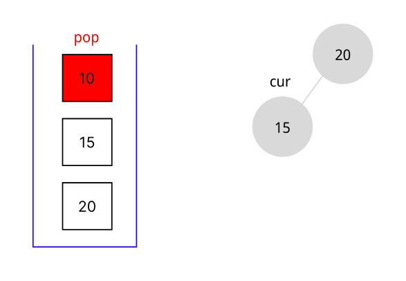 // 오른쪽 노드가 없거나 이미 방문했다면 cur pop