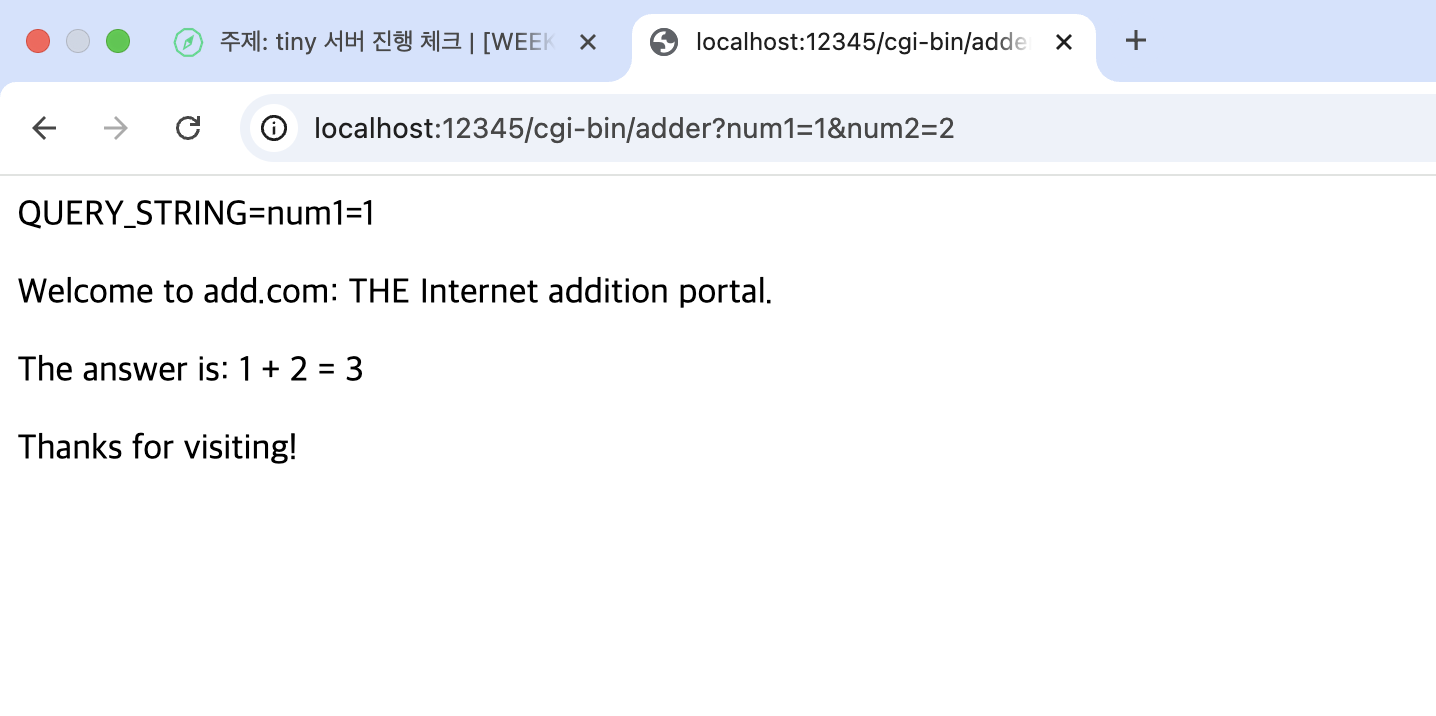 위와 같은 URL로 Tiny 서버에 GET 요청이 수신된다면 num1=1&num2=2의 내용을 인자로 CGI 프로그램을 수행한다.