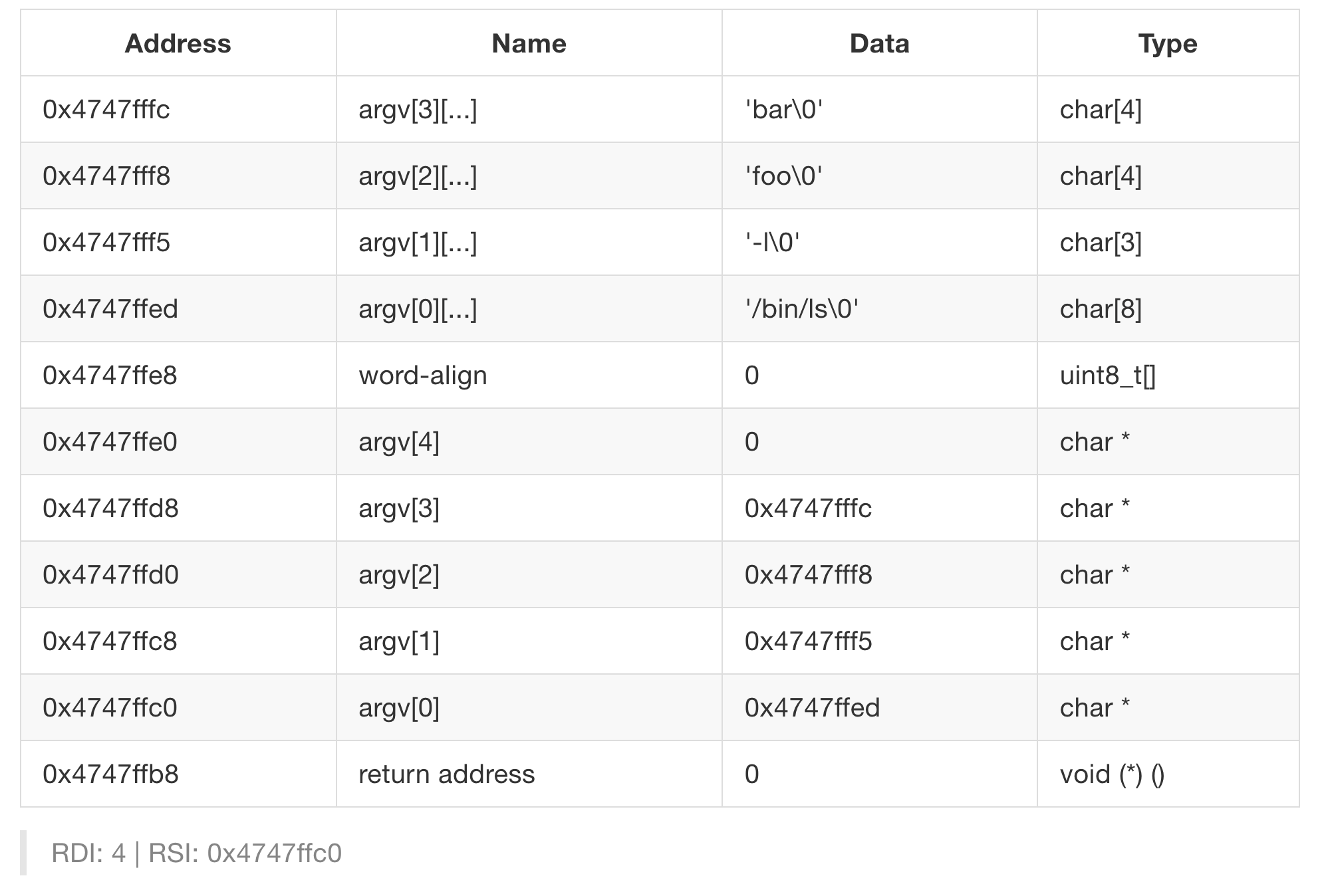 C 프로그램 기준argv[]는 다음과 같습니다.argv[0] = "/bin/ls" argv[1] = "-l" argv[2] = "foo" argv[3] = "bar" argv[4] = NULL2. 문자열들을 스택 상단에 저장