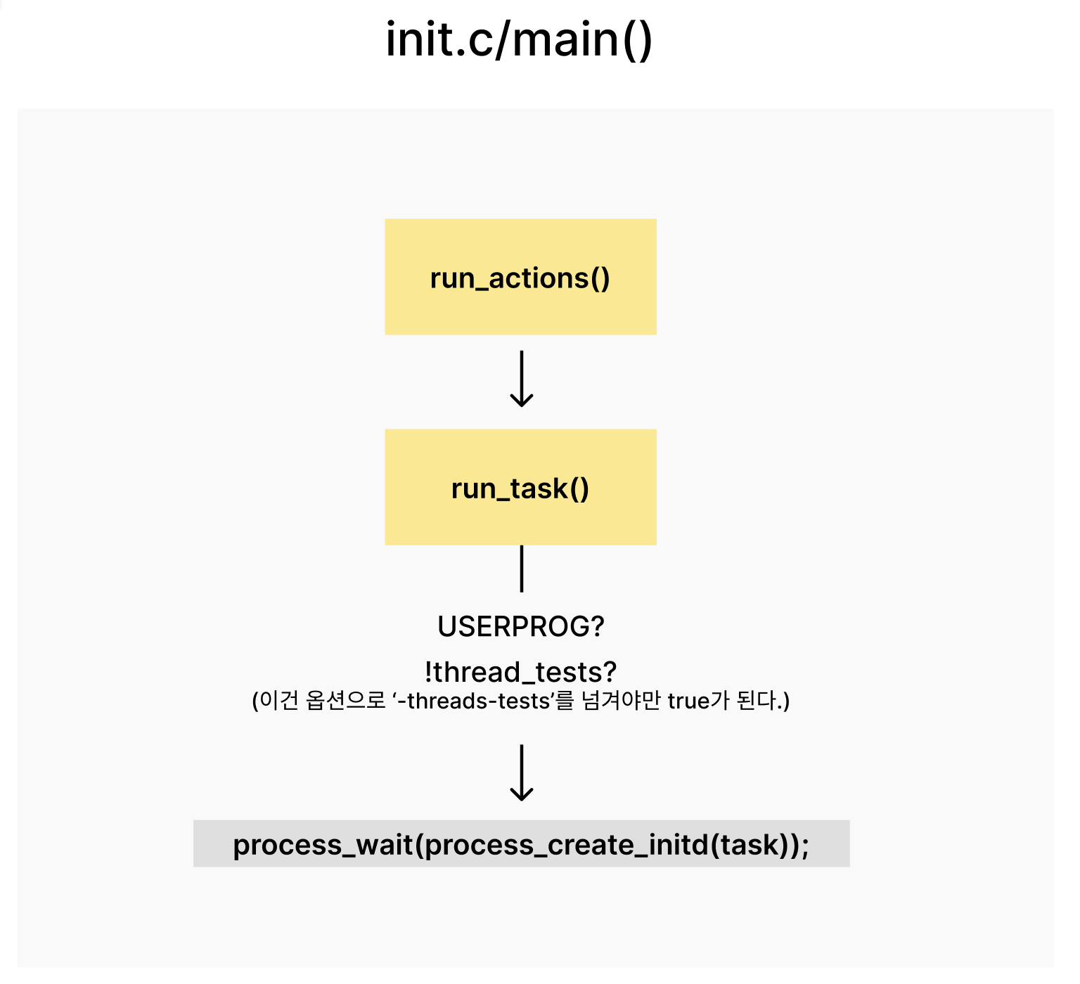 여기에서 process.c 의 process_create_initd() 가 수행되며, 새로운 프로세스의 스레드를 생성하고 실행할 준비를 한다.