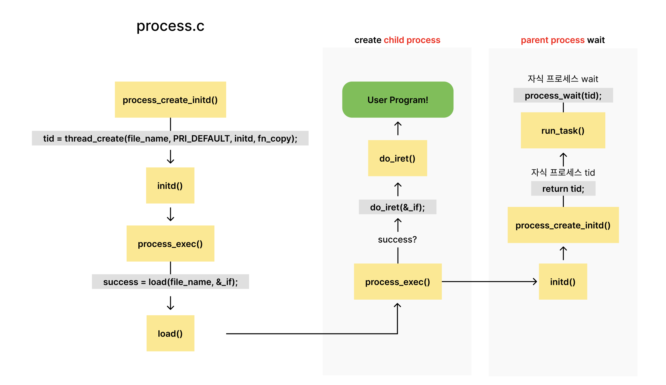 user program은 위와 같이 run_tack() 에서 분기되며, 부모 프로세스는 자식 프로세스를 만들고 기다린다.