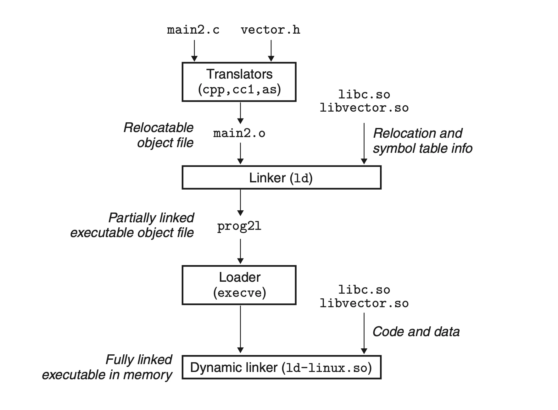 하나의 프로그램 안에 쓰이는 두 개의 파일이 있다고 하자. 링커 프로그램은 각 파일이 바이너리 목적파일로 번역된 상태에서 실행가능 목적파일을 생성하기 위해 연결한다.