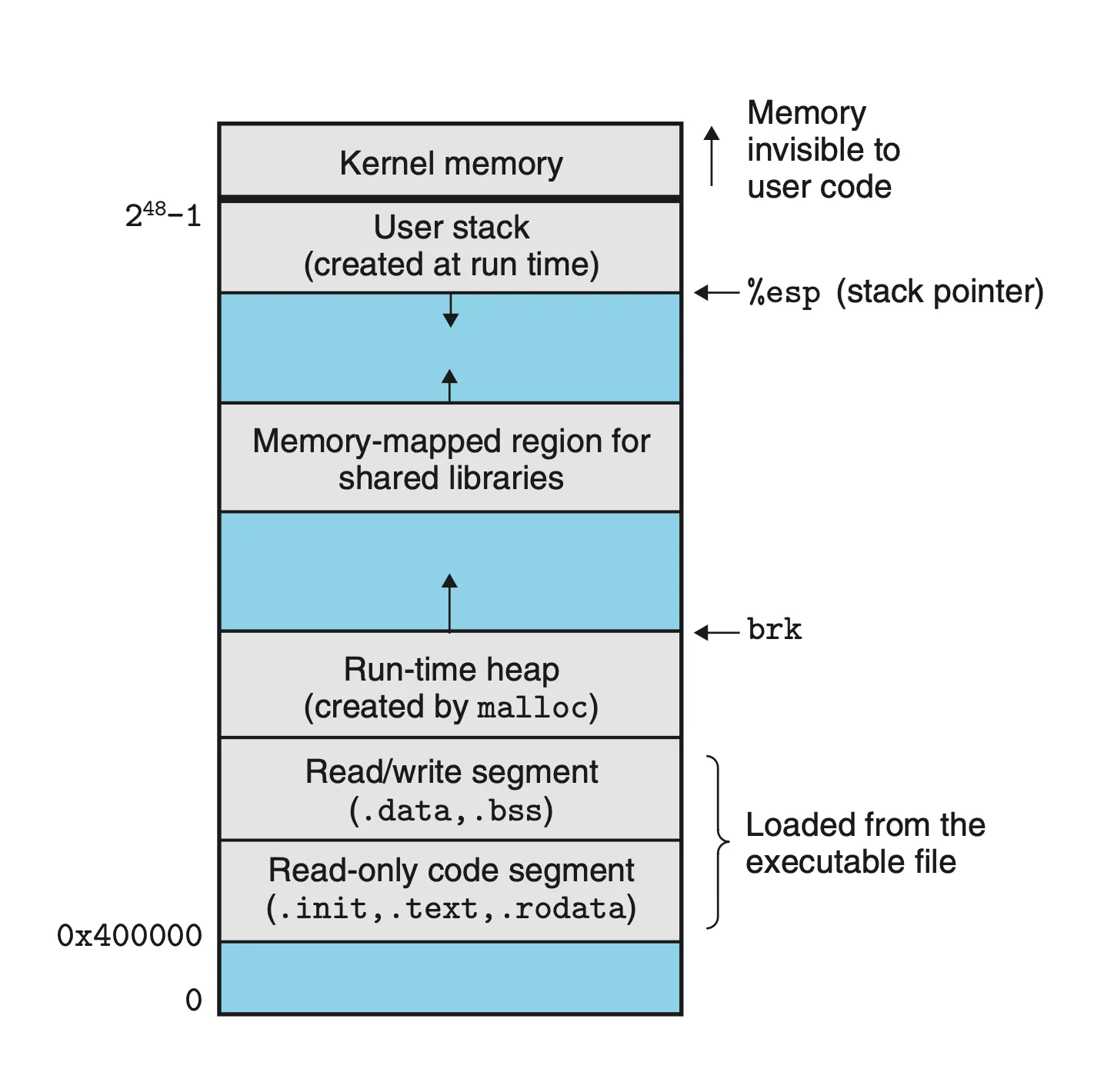모든 실행 중인 리눅스 프로그램은 위와 유사한 런타임 메모리 이미지를 가진다.