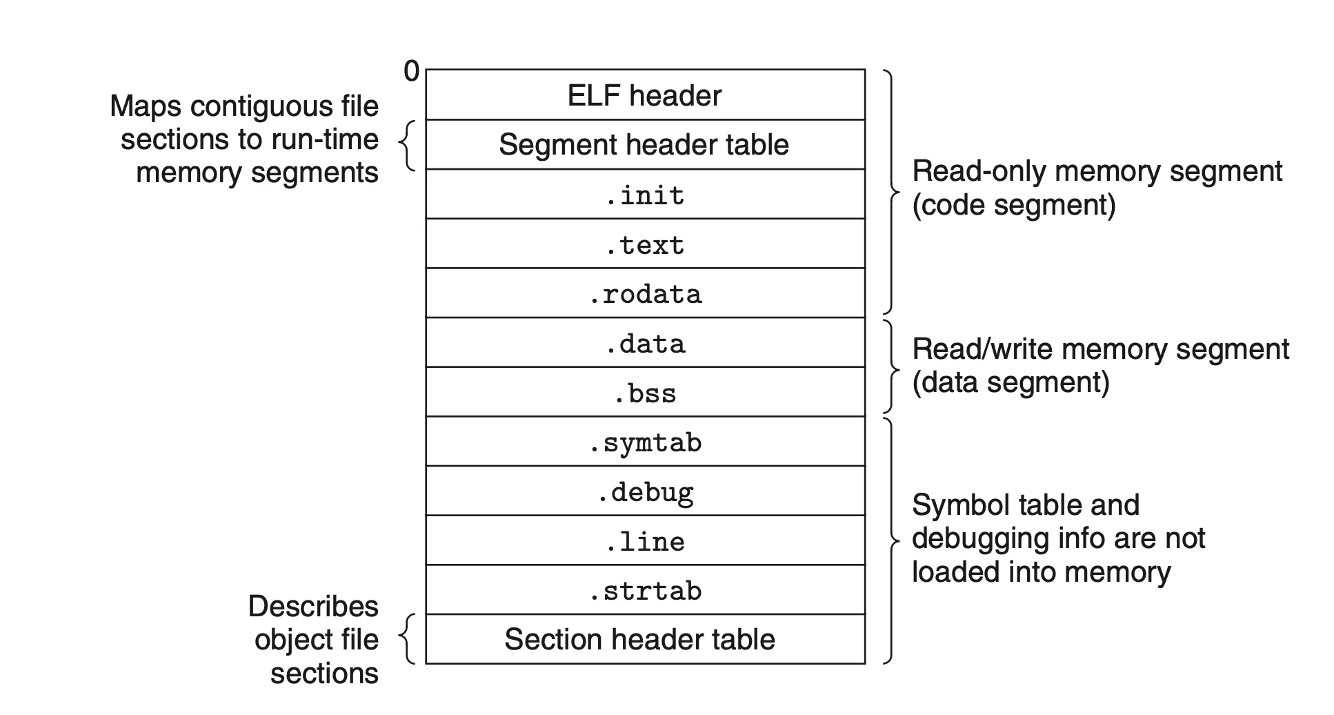 ELF 실행파일들은 연속적인 메모리 세그멘트에 매핑된 연속적인 실행 가능 파일들의 덩어리로 메모리에 로드하기 쉽도록 설계되었다.