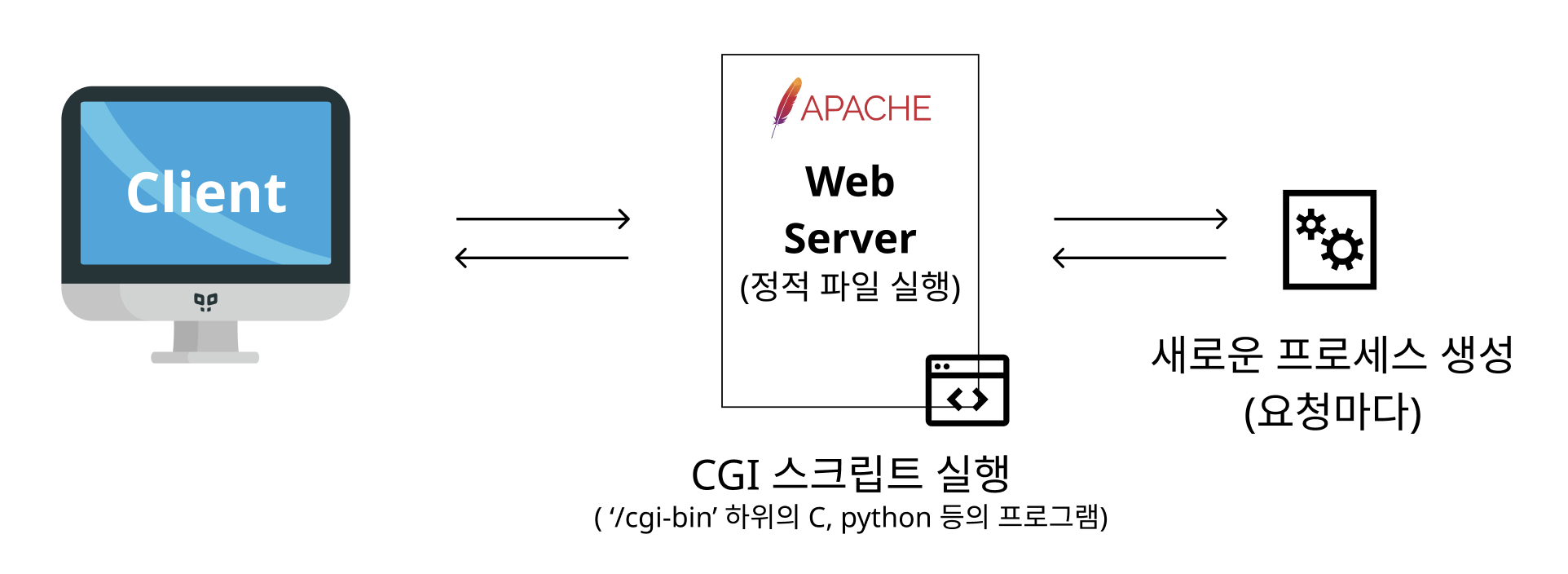 client(브라우저)에서 요청을 보낸다면, 웹서버에서는 동적 컨텐츠를 처리하기 위해 CGI 프로그램을 실행한다. 이 때 프로그램은 '/cgi-bin' 디렉터리 하위에 저장되어있다.