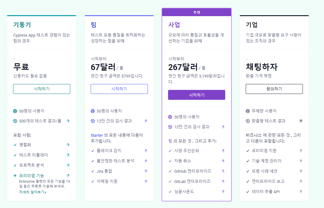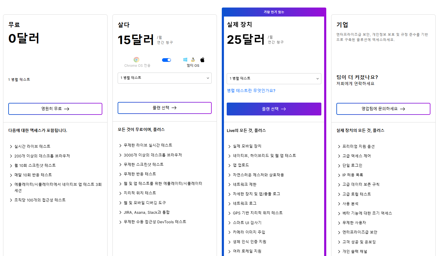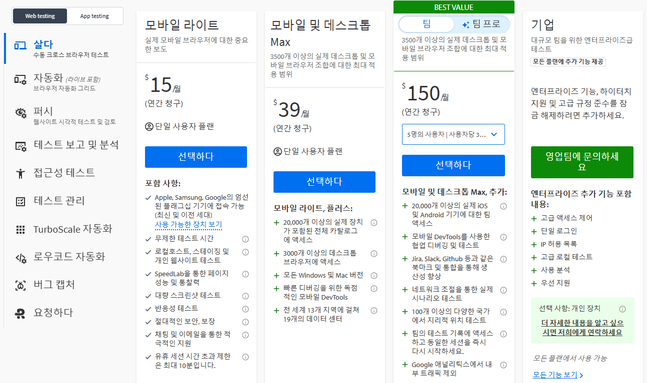 가격: 라이브 테스트 플랜은 월 $15부터 시작하며, 자동화 테스트 플랜도 제공됩니다.