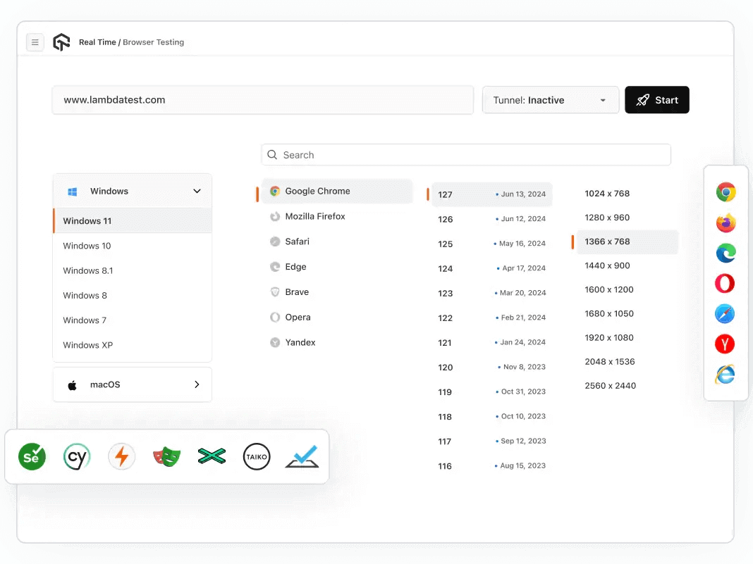 강력한 대안인 이유: LambdaTest는 3,000개 이상의 브라우저 및 OS 조합에서 웹 앱을 테스트할 수 있는 클라우드 인프라를 제공합니다. Selenium/Appium 테스트 자동화와 실시간 피드백을 지원합니다.