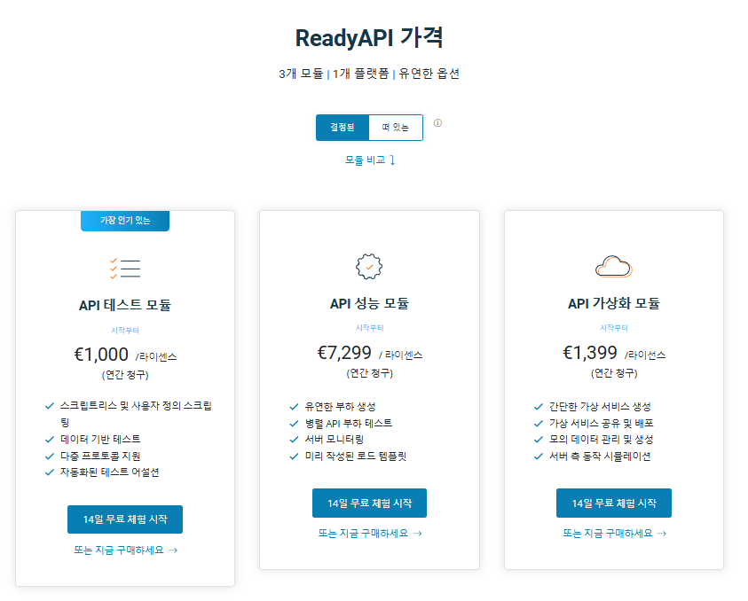 SmartBear는 다양한 팀 규모와 프로젝트 요구 사항에 맞춘 가격 정책을 제공합니다. 개인 개발자부터 대규모 엔터프라이즈까지, SmartBear의 가격 구조는 TestComplete, ReadyAPI, SwaggerHub 등 다양한 제품에 대한 기능 수준과 사용자 수에 따라 달라집니다. 예를 들어, TestComplete의 가격은 사용자 수와 기능에 따라 조정되며, ReadyAPI의 경우 API 테스트 모듈은 연간 약 $990부터 시작합니다.