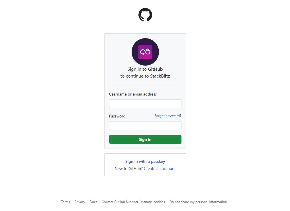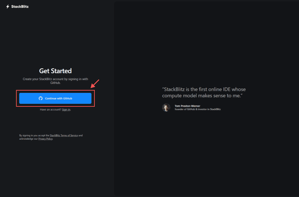 StackBlitz는 GitHub 계정을 통해 계정을 생성합니다. GitHub 계정을 준비한 후 아래 절차를 따르세요.