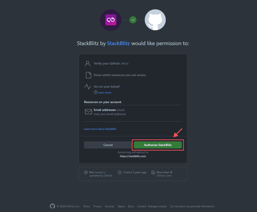 GitHub에 로그인한 후, 아래 화면으로 이동하므로, "Authorize StackBlitz"를 클릭하여 GitHub과 연동합니다.
