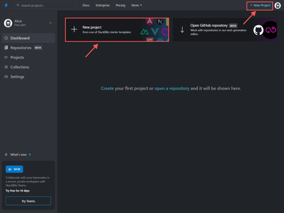 StackBlitz 대시보드에서 "New project"를 클릭합니다.