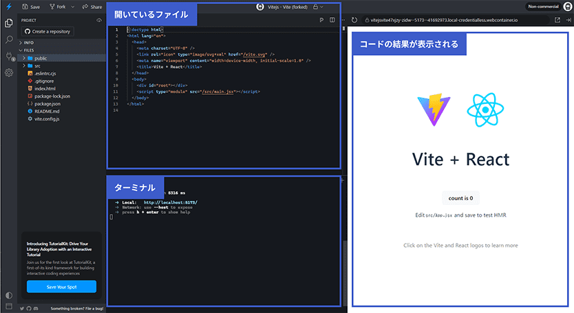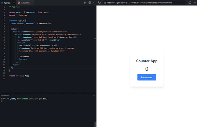 브라우저에서 바로 프로젝트를 시작할 수 있으며, 환경 설정이나 설치가 필요 없습니다. 프로젝트 내에서 코드를 편집하면 핫 리로드 기능을 통해 즉시 결과를 미리볼 수 있어 빠르게 피드백을 받을 수 있습니다.