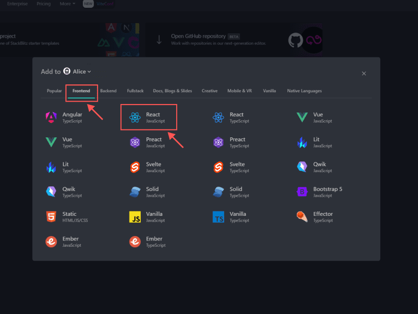 모달 창이 열리면 프로젝트 목록이 표시됩니다. 'Frontend' 탭을 선택하고 'React'를 클릭합니다.