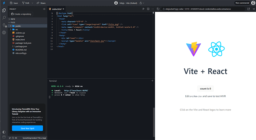즉각적인 개발 환경 구축 및 라이브 미리보기