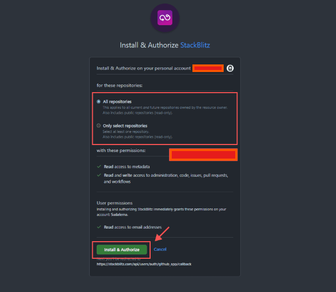 "for these repositories:"에서 모든 리포지토리 또는 선택한 리포지토리에 설치할지를 선택한 후, "Install & Authorize"를 클릭합니다.
