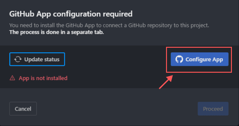 StackBlitz에서 처음으로 GitHub 리포지토리를 만들 경우, GitHub 앱과 관련된 아래 화면이 표시됩니다. 이때 "Configure App"을 클릭합니다.
