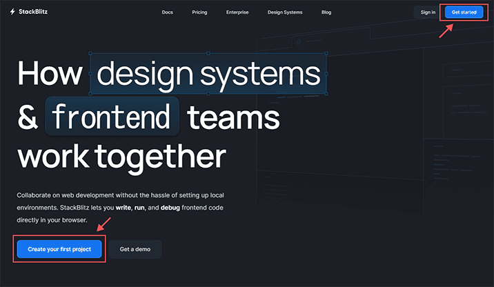 StackBlitz 웹사이트에 접속한 후, "Create your first project" 또는 "Get started"를 클릭합니다.