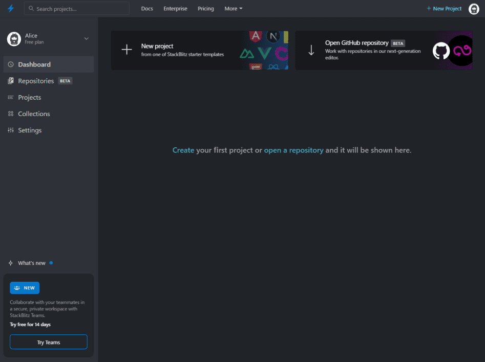 StackBlitz는 웹 브라우저에서 바로 작동하는 온라인 코드 편집기이자 통합 개발 환경(IDE)입니다. React와 같은 프론트엔드 프레임워크 및 라이브러리 개발에 사용할 수 있습니다. 개인 플랜은 무료로 이용할 수 있으며, 만들 수 있는 프로젝트 수는 무제한입니다(2024년 7월 현재). 개인 학습 목적이라면 무료 플랜으로 충분히 활용할 수 있습니다.