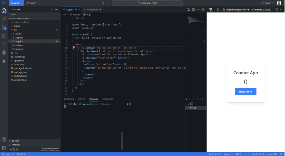 그럼 실제로 어떻게 사용하는지, React 애플리케이션을 예로 들어 사용법을 설명하겠습니다. 이 핸즈온에서는 TailwindCSS를 사용하여 간단한 카운트업 애플리케이션을 만들 것입니다. 핸즈온을 통해 로컬에서 개발할 때와의 차이점이 무엇인지 살펴보겠습니다.