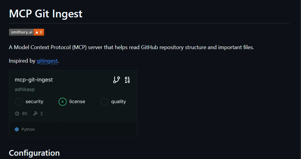 git_directory_structure와 git_read_important_files라는 두 가지 도구를 통해 README, 구성 파일 등을 LLM이 직접 읽고 분석할 수 있습니다.