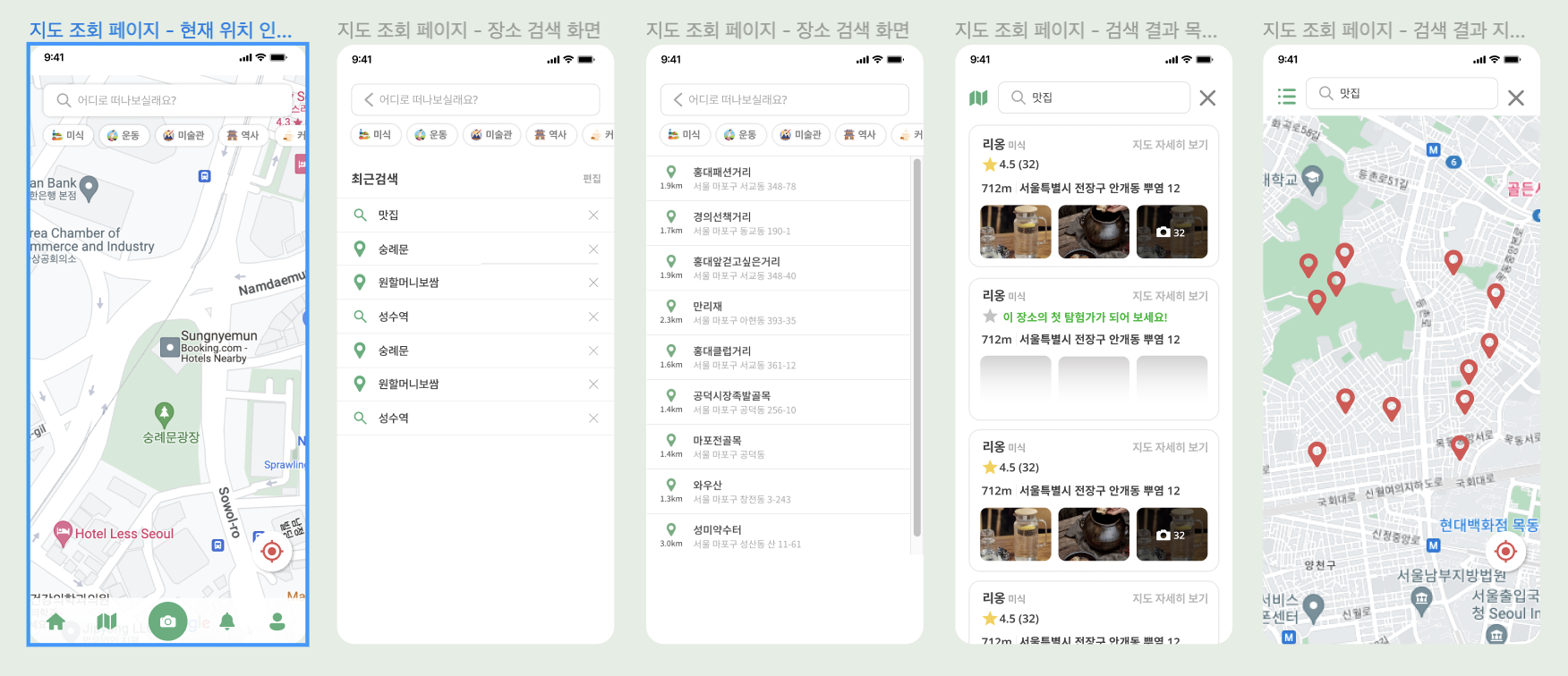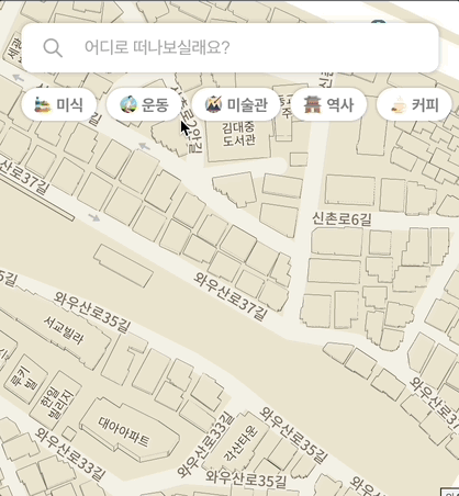 그래서 아예 세가지 페이지로 나누어서 구현해봤다. 첫번째 페이지는 지도 페이지 이고 폴리곤을 활용해 원하는 구역을 클릭하여 접근할수있는 기능을 가지고 있고, 두번째 페이지는 검색페이지로 검색을 담당하는 페이지로 타이핑 하기전엔 최근 검색어, 타이핑 중엔 실시간 검색 로직 기능을 가지고있으며, 세번째 페이지는 검색결과 페이지로 검색 결과 장소들을 리스트 및 맵 뷰로 선택해서 볼수있는 기능을 가지고 있다.