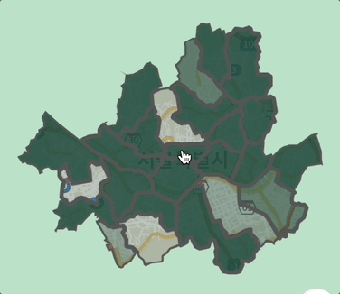 지도 페이지의 주 기능은 우리 프로젝트의 핵심 기능인 서울의 구별 탐험 정도에 따른 폴리곤의 투명도 변화와 해당 구 클릭시 확대 기능 및 해당 구의 탐험 장소들을 마커로 표시해주는 기능을 가지고 있다. 이 부분은 팀원 분께서 서울의 geojson을 활용하여 만들어 주셨는데, 서울 외곽 지역은 지도를 가려 접근이 불가능하고, 서울 내부 지역은 개인 유저의 탐험정도에따라 지도가 밝아지는 시스템이다.