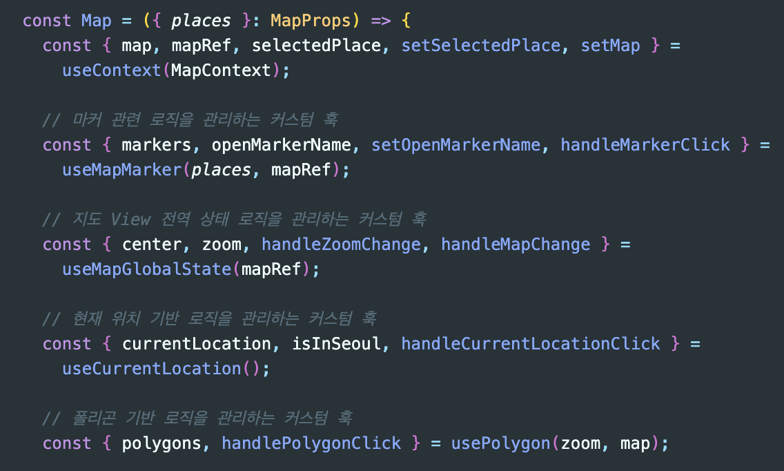 지도 관련 로직들은 각 관심사에 맞게 커스텀 훅으로 분리하여 관리하였다. 지도 관련 페이지를 세가지로 나눠서 이동하다 보니까, 현재 보고있는 지도의 위치 정보를 전역상태로 관리해야 했고, 지도의 센터, 줌 레벨이 변할때마다 트래킹을 하는 로직이 필요했다.