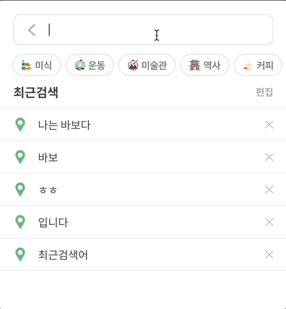 검색 페이지는 크게 두가지 기능으로 나누어져있다. typing 중이 아닐때 보여지는 최근 검색어 패널과 typing 중일때 실시간 검색 기능. 최근 검색어 기능은 로컬스토리지 접근과 따로 JSON 파싱없이 쉽게 사용할수있는 recoil-persist를 활용하여 구현하였고, 실시간 검색 기능은 navigator 객체의 geolocation api를 활용한 현재 위치기반으로 검색어 디바운싱을 활용하여 구현하였다.
