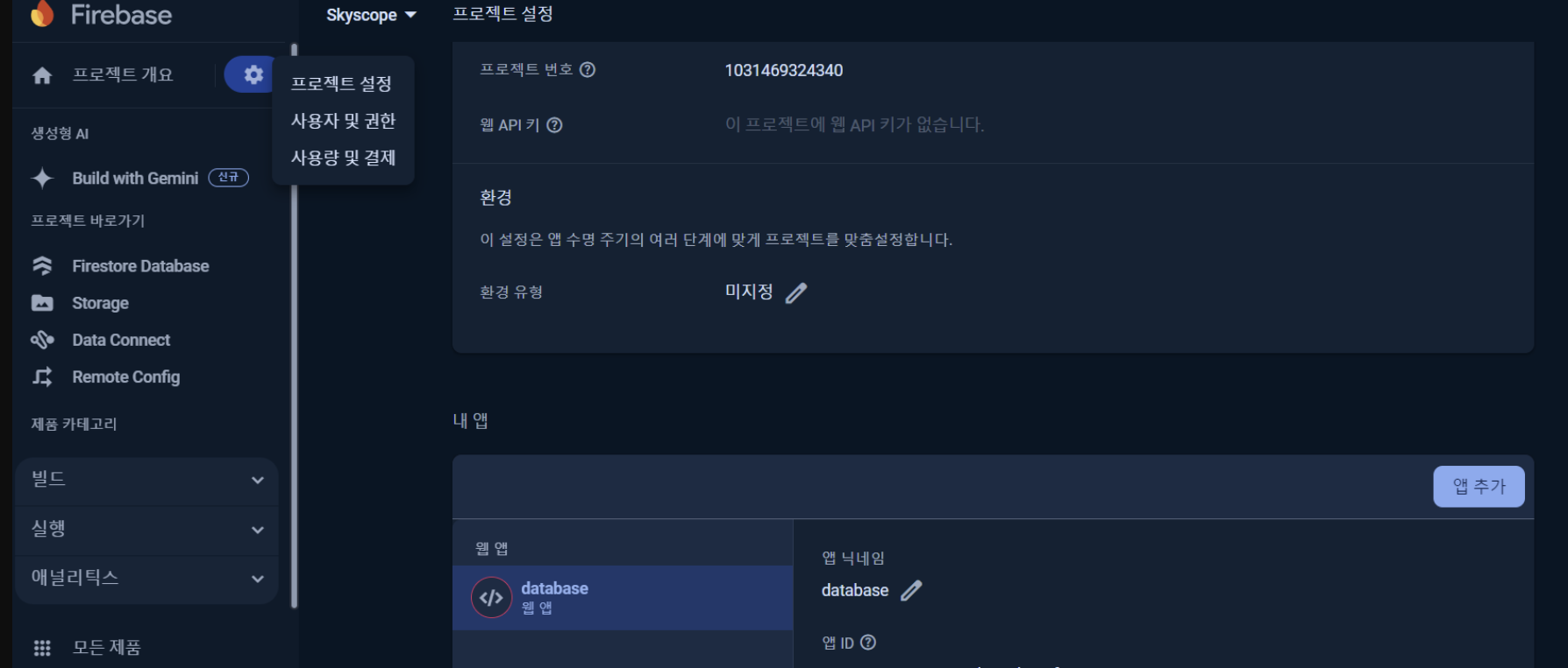 firebase 홈페이지의 프로젝트 설정에서 확인할 수 있다.