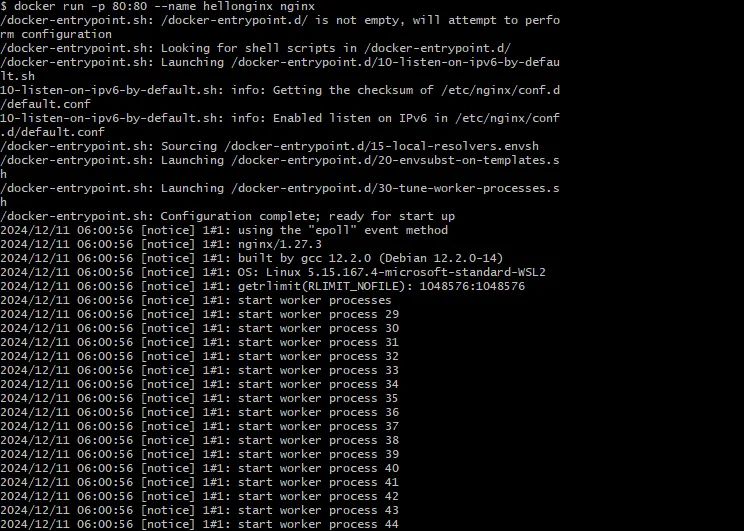 NginX는 NginX의 개발사에서 OS위에 필요한 구성 요소들을 미리 준비하고 NginX를 실행할 준비가 되어 있는 상태를 이미지로 저장 후 공유한다. 그리고 우리는 Docker run 명령어에서 nginx라는 이름의 이미지 이름을 입력하면 그 이미지를 다운 받아서 격리된 공간에 컨테이너가 실행된다. 컨테이너 실행과 동시에 이미지 안에 있는 NginX 프로그램이 함께 실행되는 것이다.