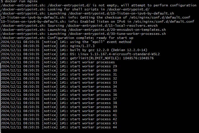 nginx의 경우는 지속적으로 실행되는 데몬 프로세스이기 때문에 -d옵션을 통해 백그라운드로 실행하지 않으면 사진과 같이 지속적으로 로그가 출력된다.