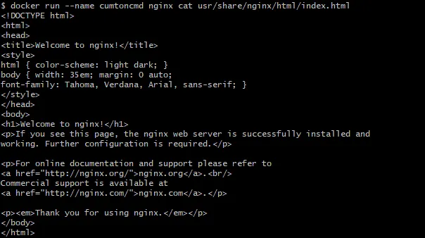 cat 명령어는 컨테이너 실행 시 실행되는 명령문이며, 일회성이기 때문에 백그라운 실행 옵션을 붙여주지 않아도 nginx의 index.html이 일회성으로 출력되고 곧 바로 사용자의 입력창으로 돌아오게 된다.