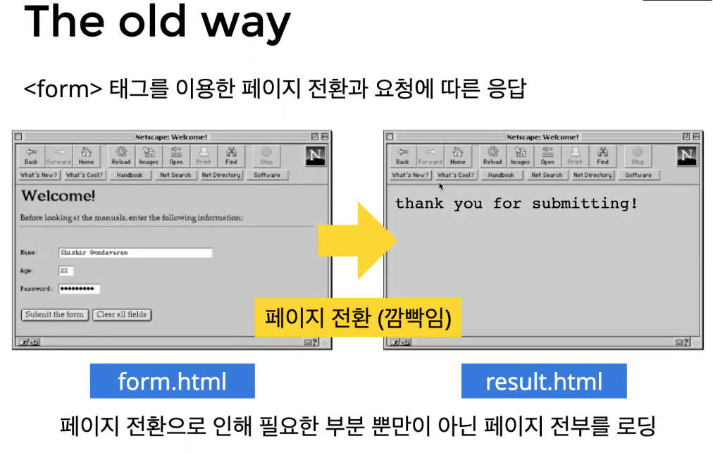 예전에는 위의 예시처럼 어떠한 요청을 보내면, 페이지 전부를 새로 렌더해야 했었습니다.