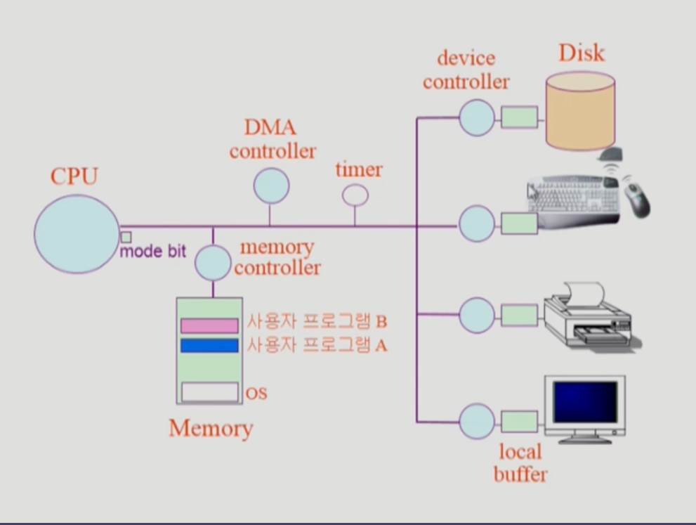 1 : User mode => 사용자 프로그램 수행0 : kerner mode => OS Code 수행 사용자 프로그램을 수행 중에는 mode bit가 1이며 이때 사용자 프로그램이 I/O device에 접근하기 위해서는 CPU를 통해 메모리에 상주하는 OS에 접근해야 함. 이때 interrupt를 걸어주면 mode bit가 0으로 바뀌고 커털 함수가 실행. 이후 I/O device에서 데이터 처리를 완료하면 I/O device controller가 interrupt를 걸어주고 mode bit가 1로 바뀌며 사용자 프로그램이 다시 cpu 점유를 가져가게 됨.