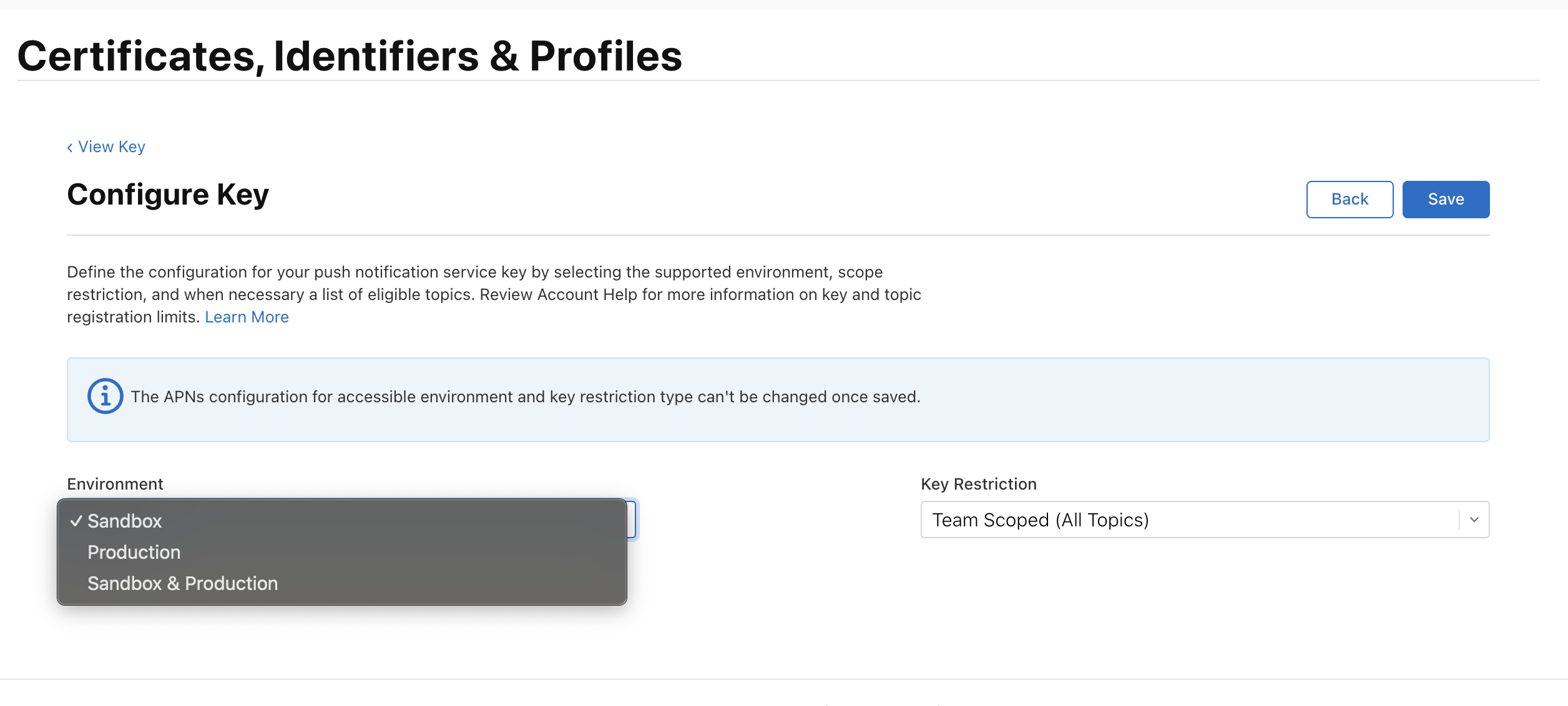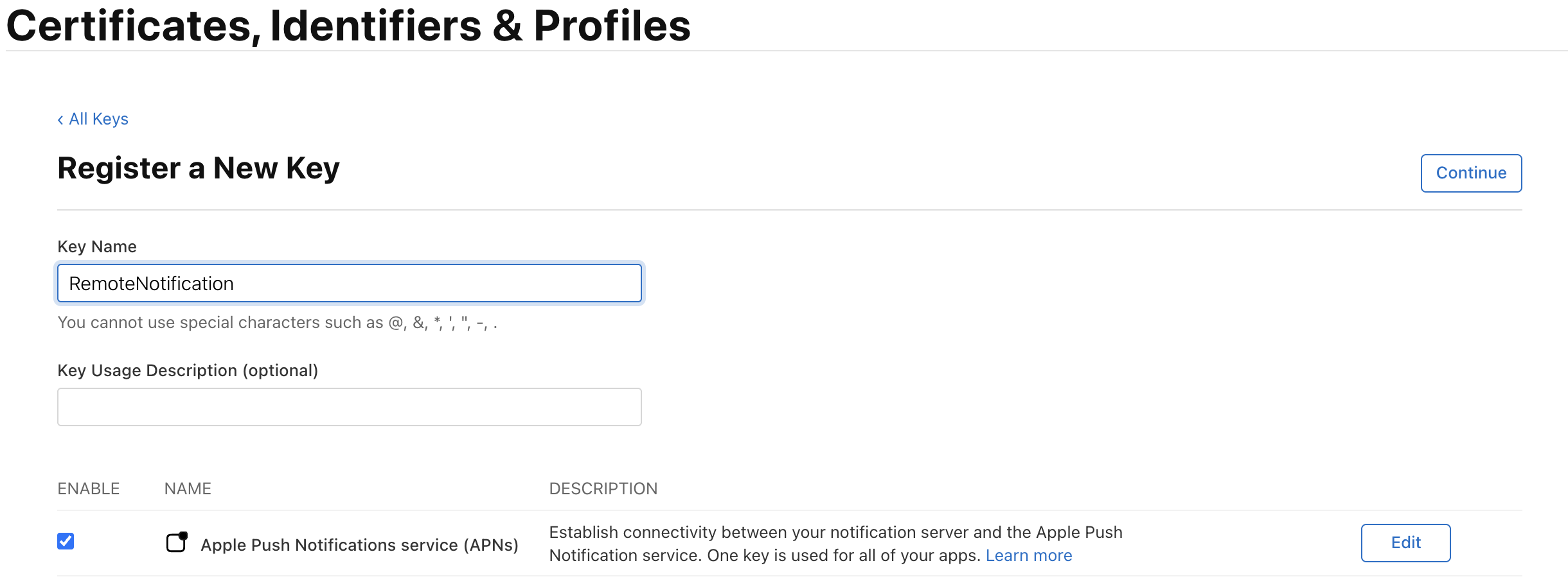 그 후, 애플 개발자 계정에 들어가서 Certificates, Identifiers & Profiles을 찾은 뒤 APNs를 선택해주고 Key를 발급받는다 (p8파일이다)