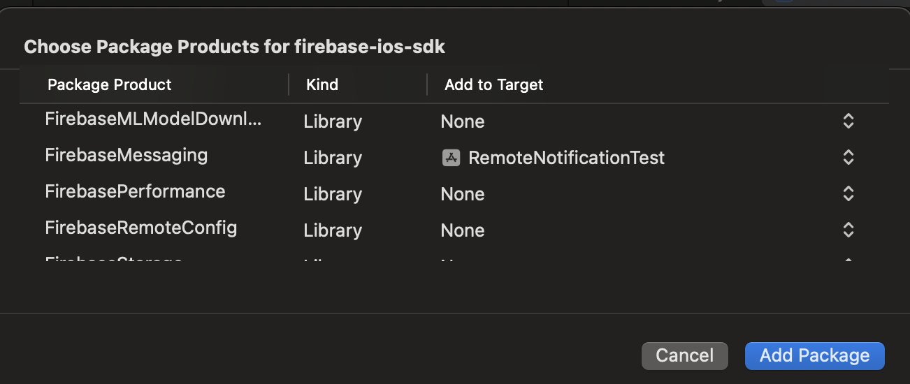 SPM으로 FirebaseAnalytics와 FirebaseMessaging을 추가해준다.