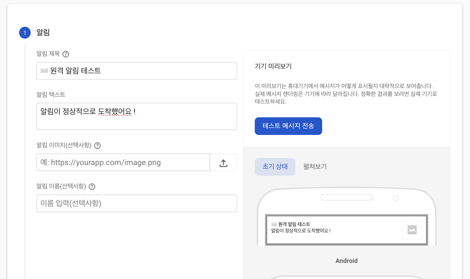 이런 창이 뜨면 원하는 제목과 텍스트를 입력해주고, 테스트 메시지 전송 버튼을 눌러준다.