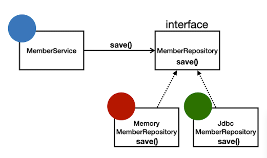 MemberService가 인터페이스 MemberRepository의 save()를 호출