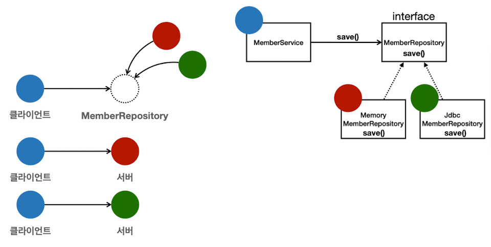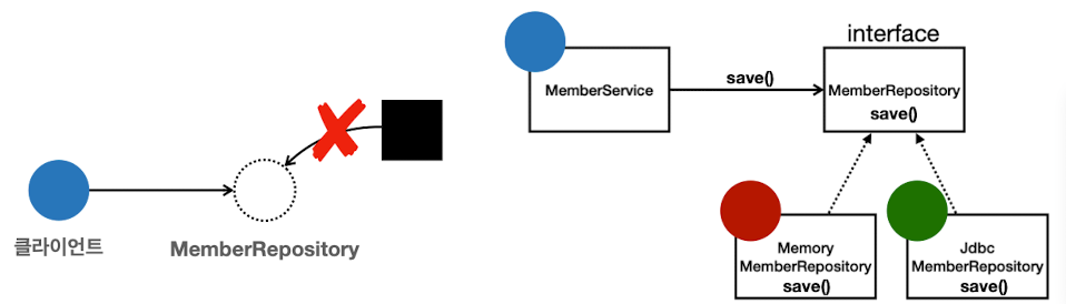MemberService는 인터페이스에 의존하지만, 구현 클래스도 동시에 의존함 (의존 = 내가 저 코드를 알아)MemberService 클라이언트가 구현 클래스를 직접 선택한다. MemberRepository), 구체화에에도 의존(MemoryMemberRepository)MemberService는 MemberRepository 인터페이스에만 의존하도록 설계해야 한다.