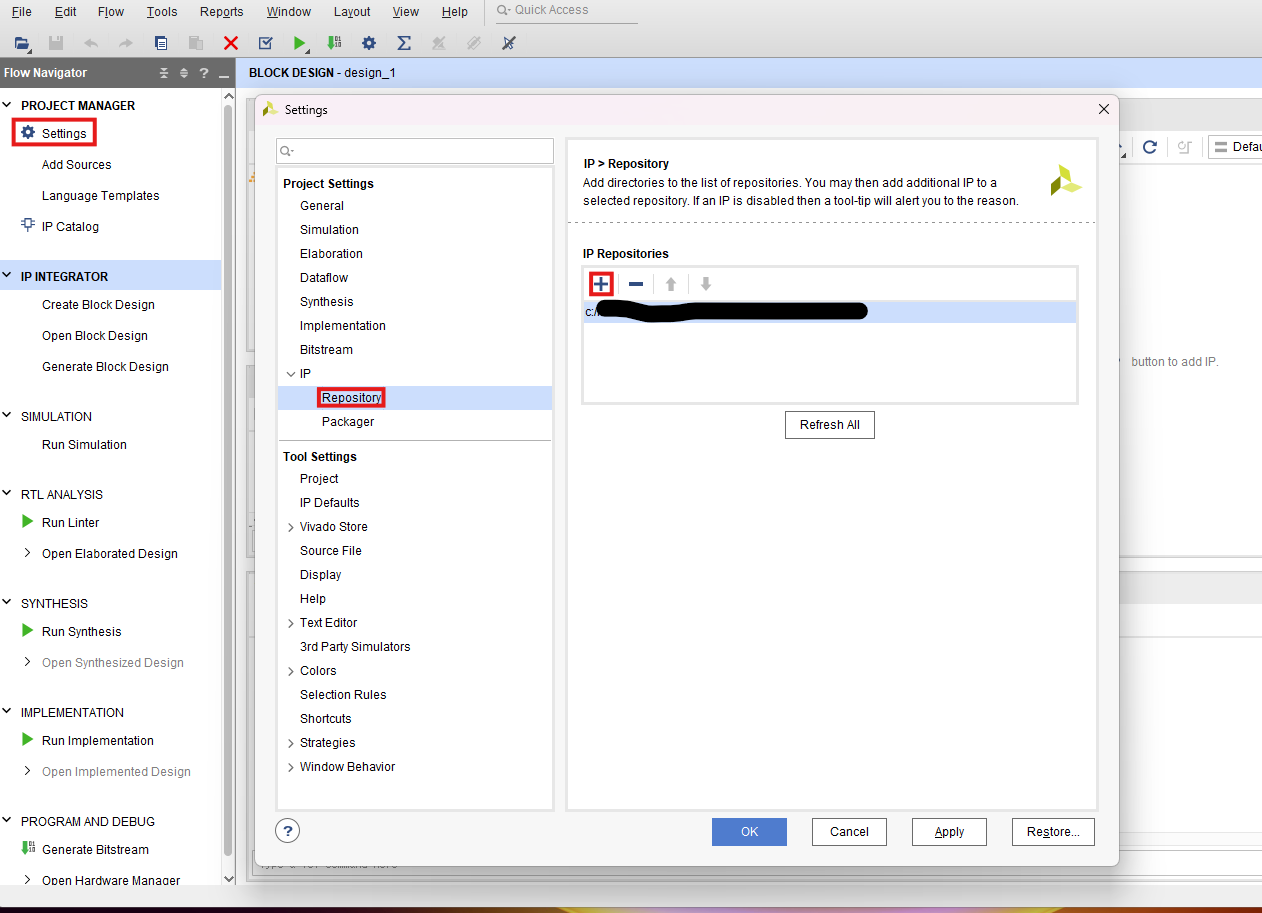 좌측 Flow Navigator에서 Setting - IP - Repository - '+' - Custom한 IP 선택